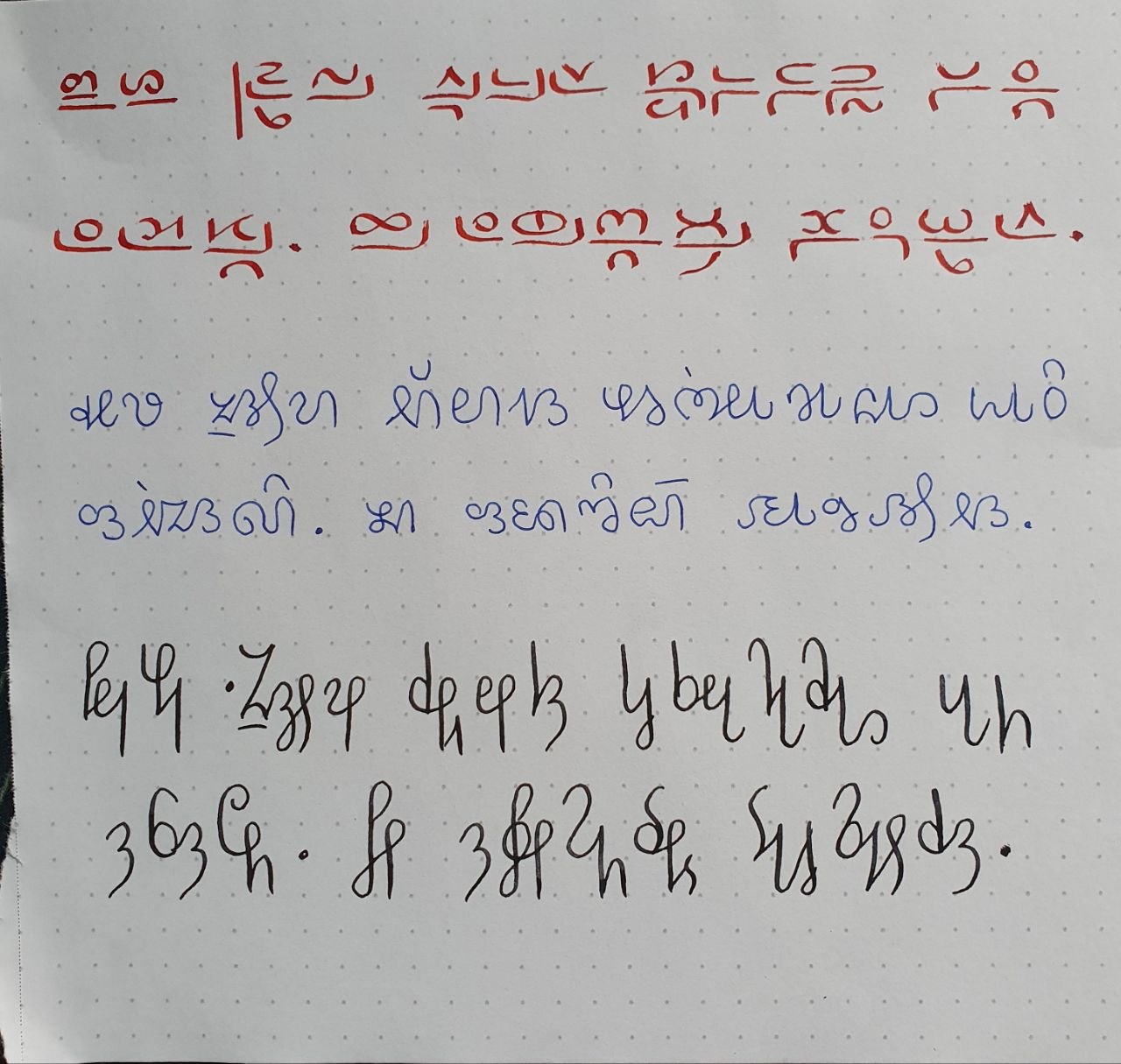 The first script is similar to Hangul, featuring CV or CVC syllables arranged vertically. It is built in a way similar to the Shavian alphabet: pairs of voiced and unvoiced consonants are represented by the same sign, rotated 180 degrees.